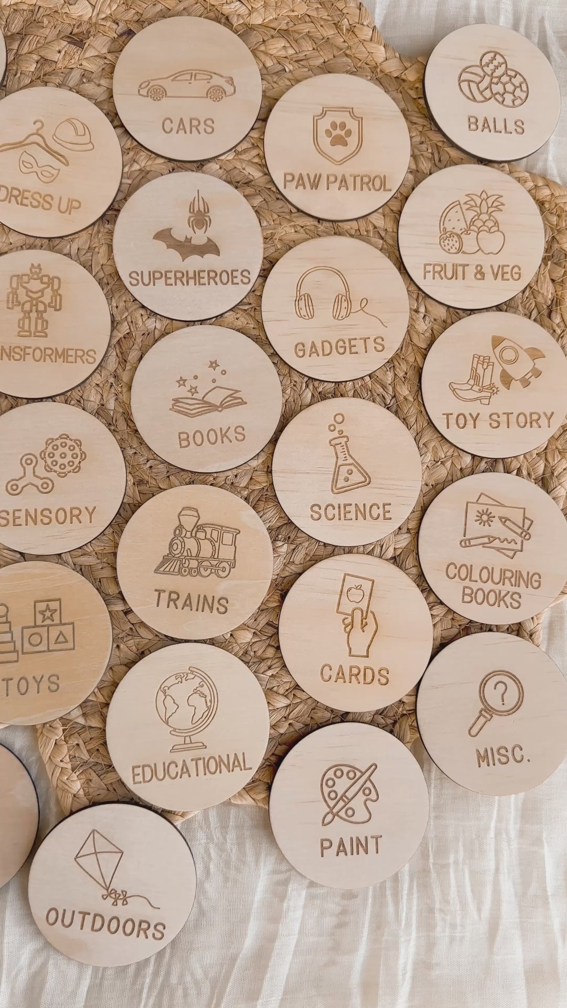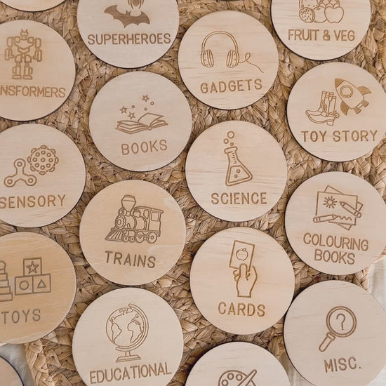 Keep toys organised and tidy with our custom wooden engraved toy storage labels, designed to make clean-up time easy and fun for children. Each round wooden disc is carefully engraved with both a name and a matching icon, helping kids quickly recognise where their toys belong, even before they can read.